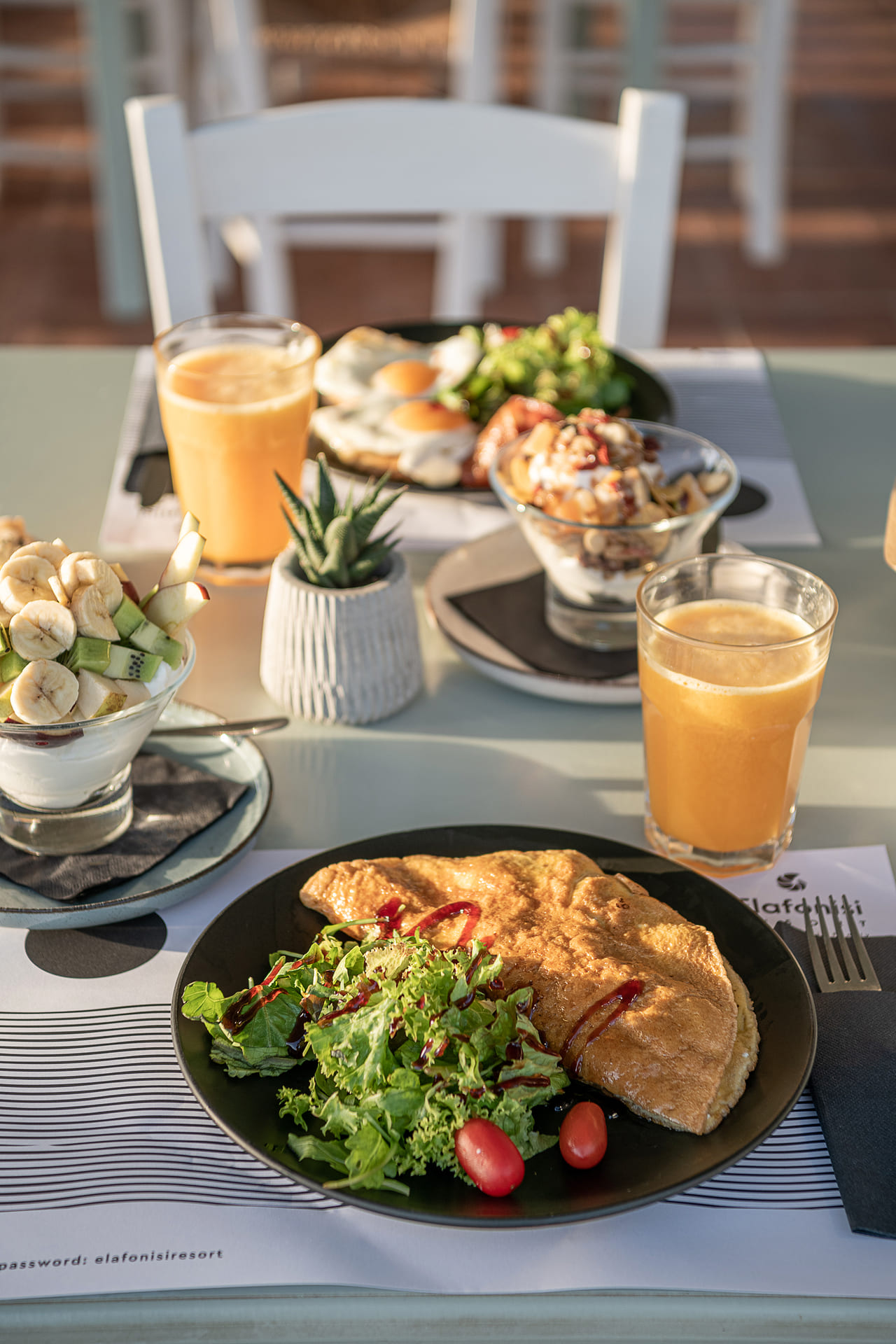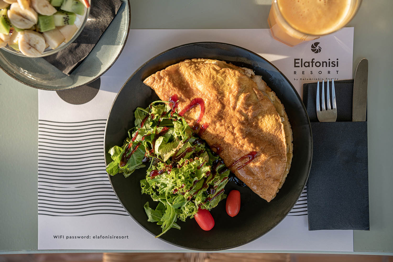 Our à la carte restaurant Taverna Kalomirakis Family is open from 8:00 am till 22:00 offering breakfast, lunch and dinner. Start your day with a rich menu for breakfast including bread, thyme honey, Cretan cheese pies, Sfakiani pies, yoghurt, fresh eggs, seasonal fruit, hot pancakes and sandwiches. Later in the day enjoy famous dishes of the Cretan and Greek cuisine cooked with fresh local ingredients, salads, meat and fresh fish from Elafonisi area. There are also vegetarian dishes. A selection of wines from Crete and other parts of Greece is offered, too. Our helpful staff is always at your disposal.